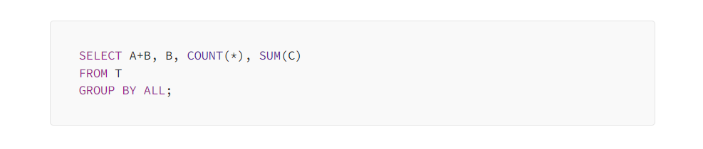 This wasn’t mentioned in the summit, but might be the most exciting feature released: all other SQL dialects* ask you to type at every column you want to GROUP BY like a caveman, but Snowflake has added an ALL option.